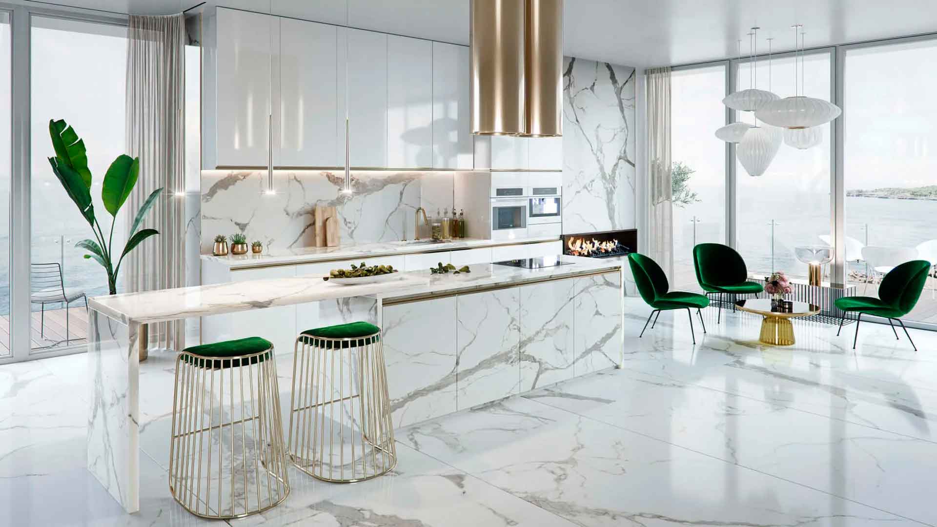 Натуральный камень предпочитает большие пространства. Мраморную столешницу лучше выбрать для кухни в большом особняке в классическом стиле.