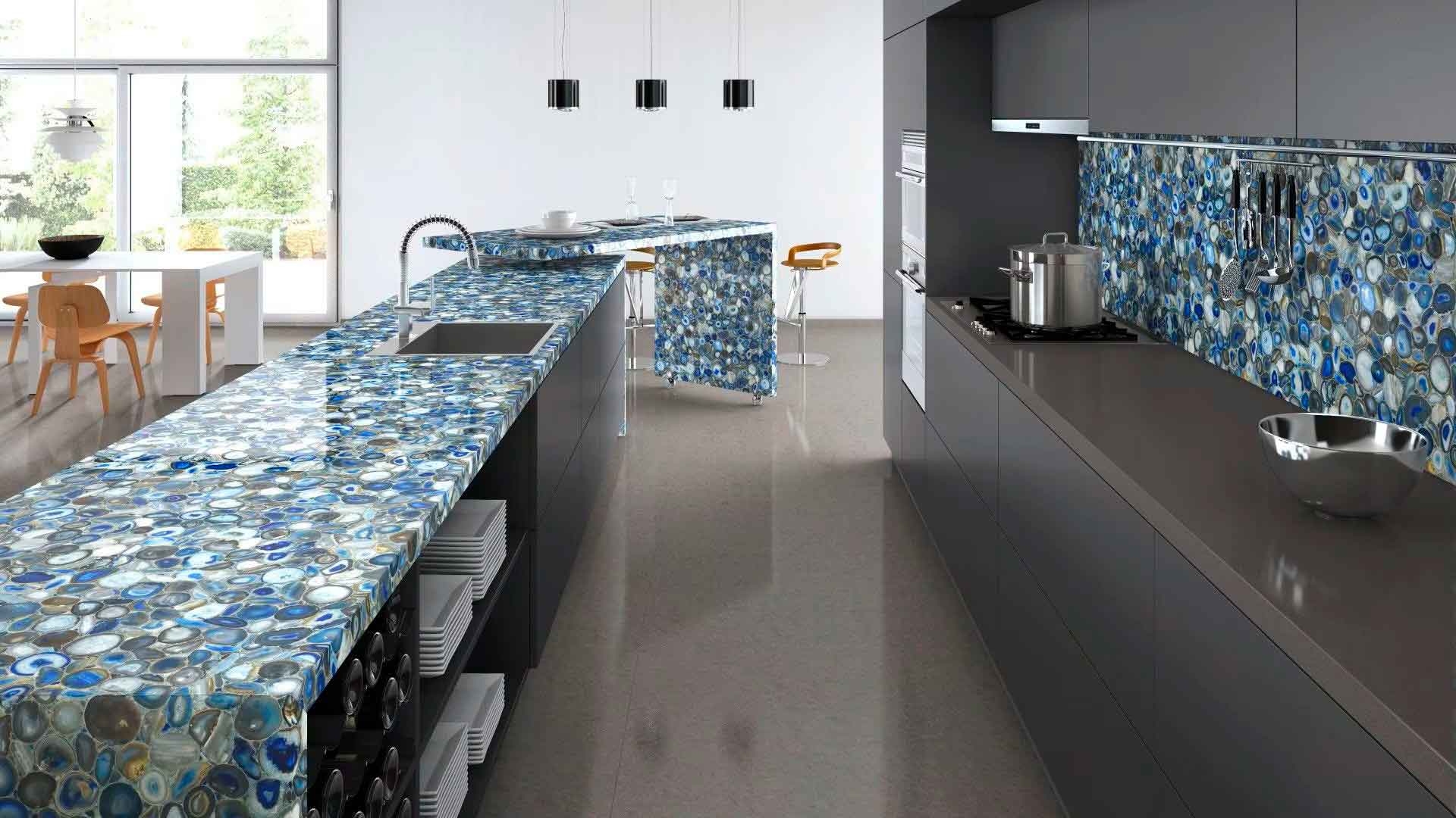 Неизменно популярны столешницы, которые называют «жидким камнем». С помощью специального состава можно залить интересную форму, превратив столешницу в произведение искусства. Можно изготовить покрытия с декоративным бордюром или пристеночным возвышением. В состав такого покрытия может входить каменная крошка, морские камушки и ракушки, гербарии, красивые спилы деревьев, узоры разного происхождения.