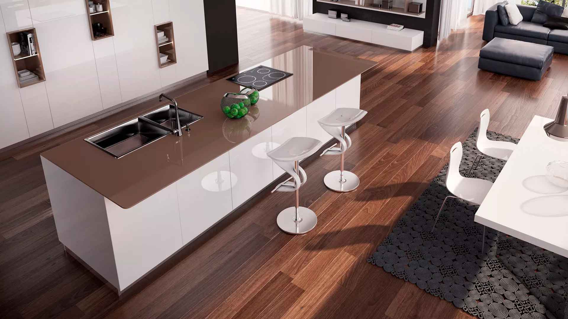 Стеклянные поверхности просты в эксплуатации и имеют оригинальный дизайн. Их легко чистить и мыть, стекло не боится воздействия высоких температур, оно довольно прочное. Стеклянные столешницы могут быть прозрачными, матовыми, тонированными, оформленными пескоструйным рисунком или фотопечатью.